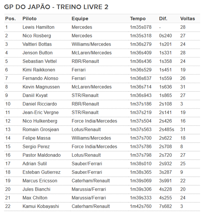 Ah, o GP do Japão foi vencido por Lewis Hamilton, que deu um show na chuva e manteve a liderança do campeonato, agora com 10 pontos de vantagem em relação a Nico: 266 a 256. Entretanto, tudo isso acabou em segundo plano, em virtude do acontecimento que se sucedeu. Rosberg chegou em 2° e Vettel completou o pódio. Ricciardo, Button, Bottas, Massa, Hulkenberg, Pérez e Vergne completaram a zona de pontuação. A próxima corrida será semana que vem, no novíssimo GP da Rússia, em Sochi.
