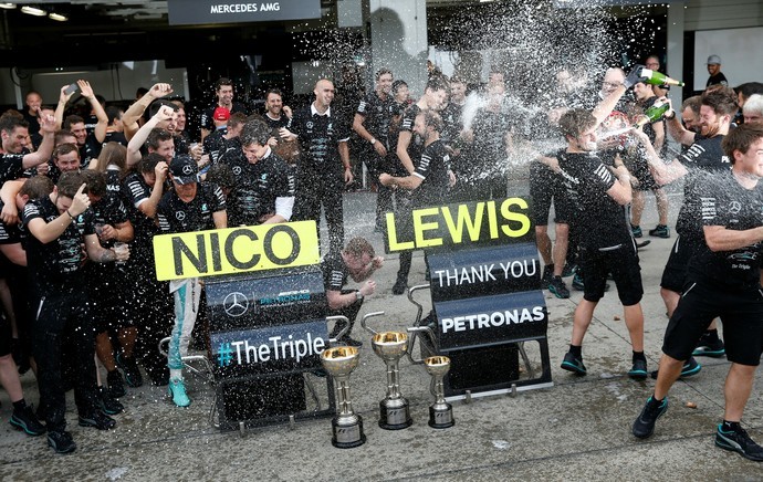 O momento do tricampeão é crítico, técnica e emocionalmente, justo no momento mais decisivo da temporada. Embora o inglês seja vítima de problemas mecânicos, é inacreditável como um piloto tão talentoso consiga largar tão mal nessa temporada. É frequente. Embora seja um problema de embreagem, fica difícil reagir no campeonato caindo para oitavo logo na primeira curva. Talvez seja fruto de um abalo psicológico do abandono da semana passada e problemas com a imprensa nos últimos dias. Enfim, Hamilton precisa emplacar quatro vitórias (100 pontos) e torcer para que Nico tenha problemas que até agora não ocorreram. A Mercedes sagrou-se tricampeã de construtores. A festa estava marcada para a Malásia, mas o abandono de Hamilton adiou a festa para a terra nipônica. Um dos maiores domínios da história da F1.