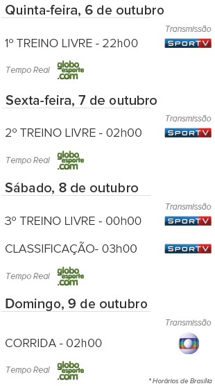 A próxima corrida será o Grande Prêmio do Japão na semana que vem, em Suzuka, nos dias 7, 8 e 9 de outubro. Até!