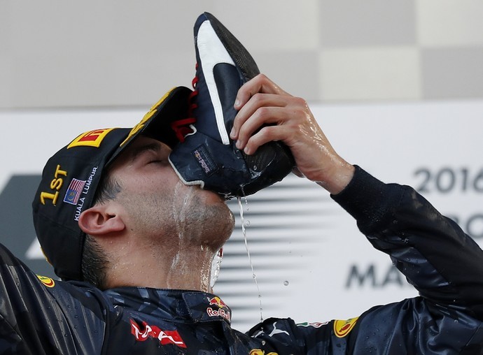 Ricciardo novamente comemorou com o "shoey" (beber champanhe na bota)! O gesto, "inventado" pelo compatriota Jim Miller, da Moto3, também foi copiado por Valentino Rossi. Até Verstappen, Rosberg e Christian Horner entraram na onda!! O australiano é, de longe, o piloto mais carismático da F1, um showman de simpatia! Ah, ele prometeu que agora só bebe quando vencer as corridas. Será que vamos esperar muito tempo de novo?