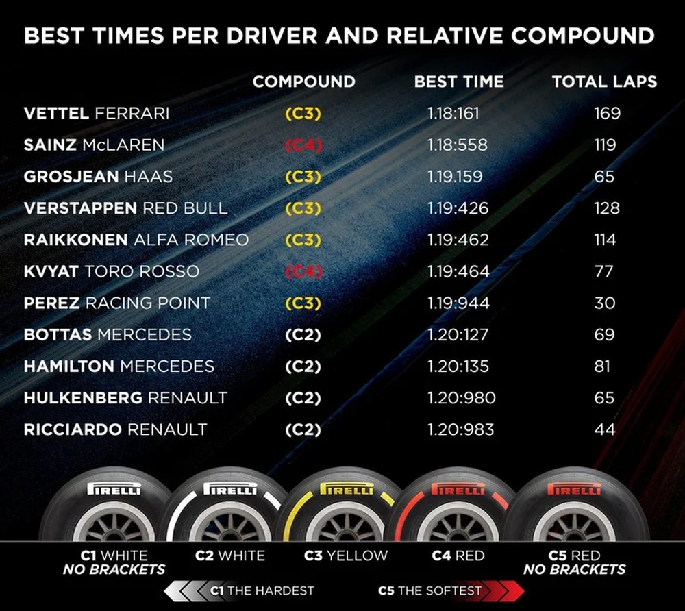 Primeiro, Carlos Sainz colocou outra vez a McLaren no topo. Usando o pneu C4, fez 1:17.144. No entanto, segundo o relato de quem está lá, os ingleses ainda estão um pouco distantes do segundo pelotão (Alfa Romeo, Renault e Haas), apesar de o MCL34 estar se desenvolvendo visivelmente bem. As 130 voltas são um outro indicativo positivo.