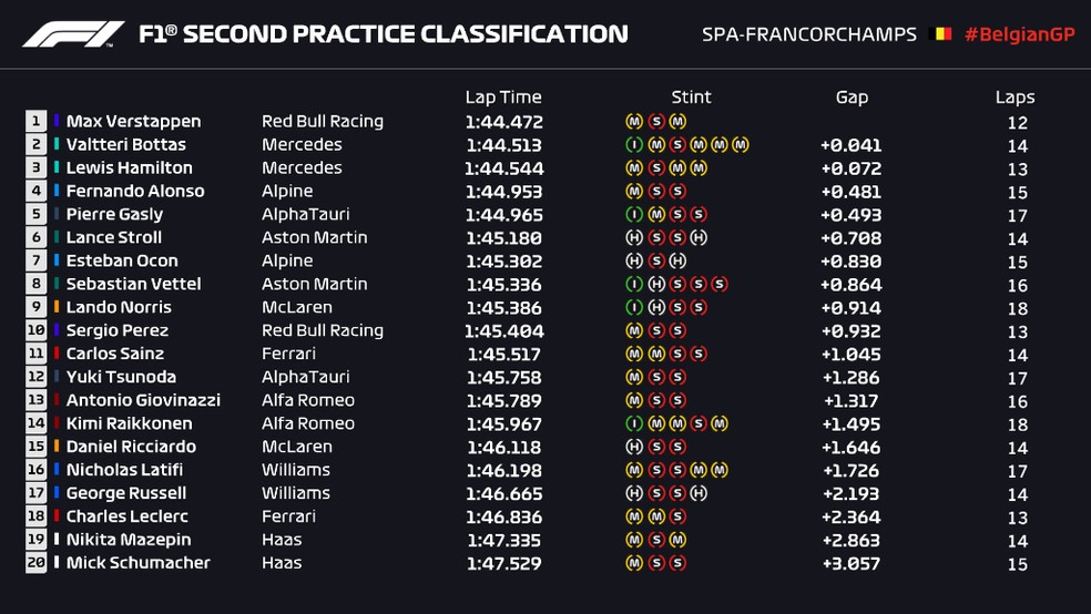 Confira os tempos dos treinos livres do GP da Bélgica: