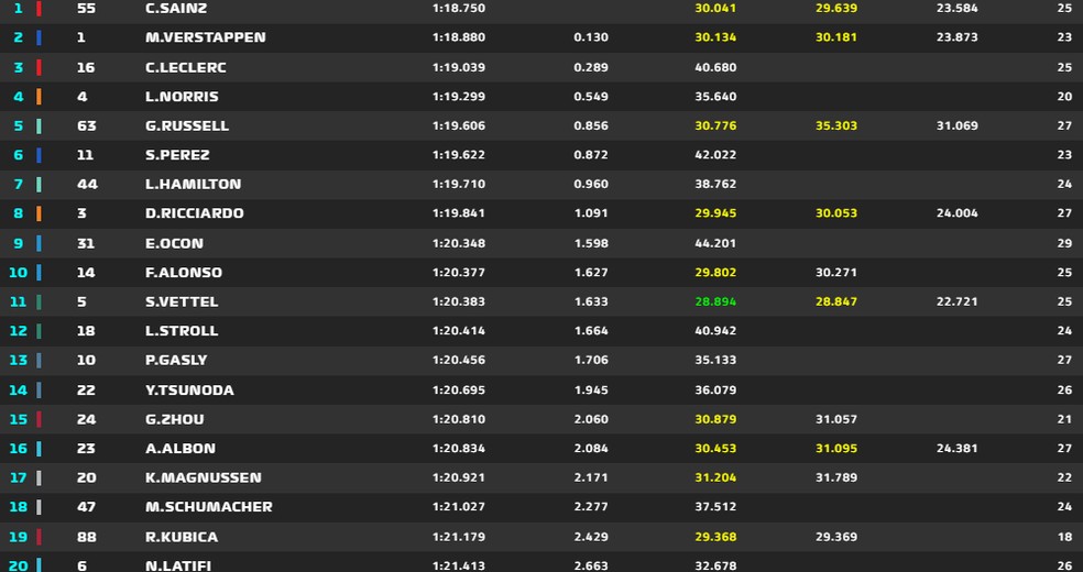 Norris é o melhor do resto, em setimo. Enquanto isso, Ricciardo afunda em 15°. Até teve um brilhareco numa ultrapassagem dupla nas Alpine, mas o tempo dele na McLaren já foi, é desperdício de dinheiro. Por falar em Alpine, a estratégia deu certo, mas Ocon segue "atrapalhando" e fechando Alonso: menos mal que o espanhol conseguiu o oitavo lugar. Dessa vez com a intervenção da equipe, Vettel fechou no top 10 e, agora, cada ponto pode ser o último na categoria.