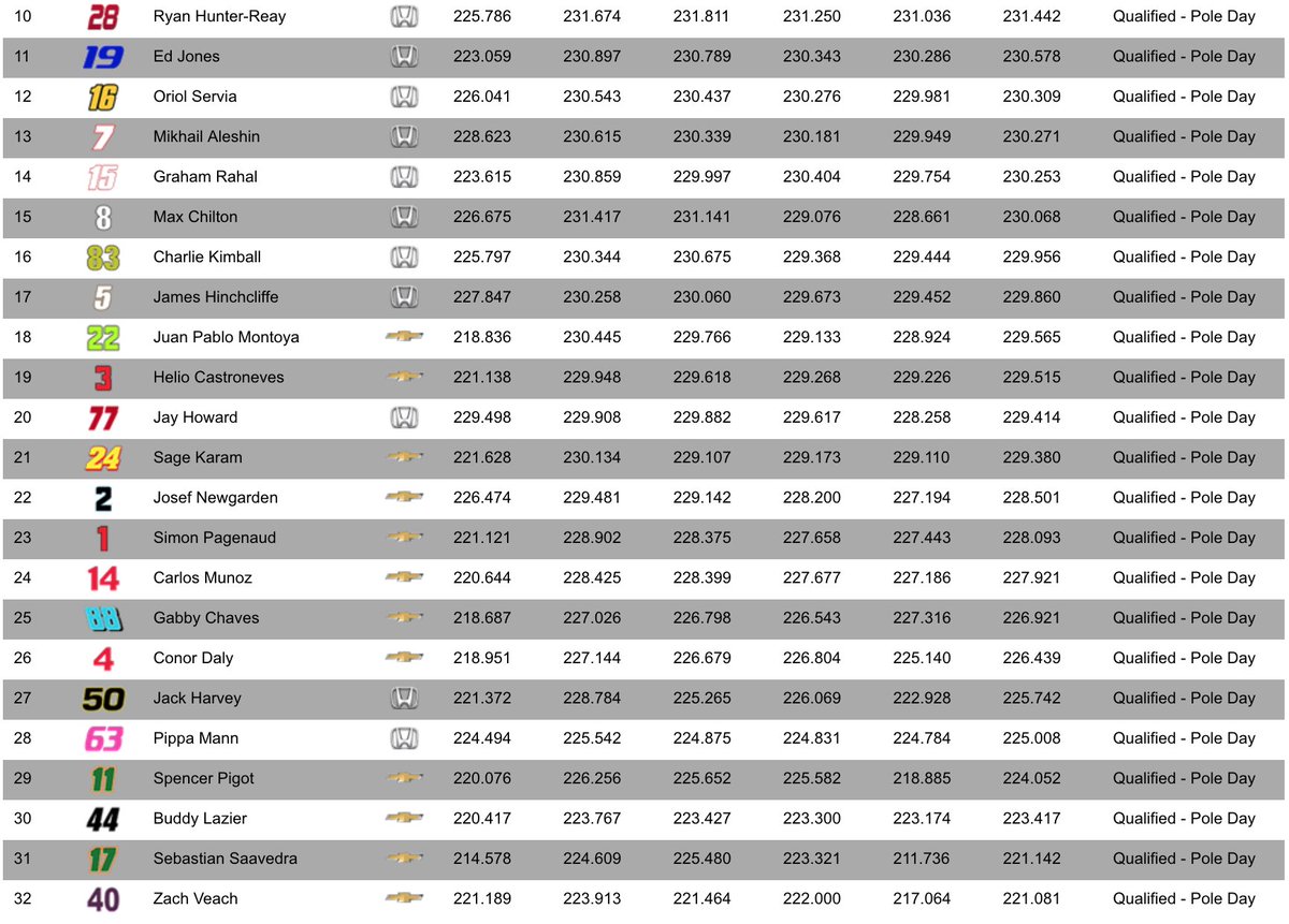 De volta a Indianápolis após o grave acidente que sofreu ano passado, Sebastien Bourdais consegue um inexplicável quinto lugar com a Dale Coyne. A equipe do pole esteve muito bem no Fast Nine. Spencer Pigot larga em sexto e Danica Patrick, em sua última corrida da carreira, é a sétima, apesar de estar sem pilotar um carro de monopostos desde 2011, quando saiu da Indy para entrar na Nascar. Mais rápido do Bump Day, Hélio Castroneves em apenas o oitavo. Scott Dixon, pole do ano passado e brigando com a Ganassi, completa a primeira parte do grid.
