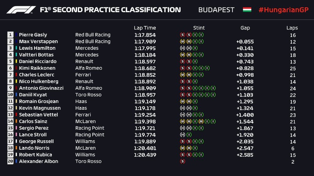 Mais uma vitória e um show de Max Verstappen. Com o mesmo carro, Gasly já tinha ficado uma volta atrás na Áustria e, na Alemanha, ficou atrás das duas Toro Rosso até bater ao tentar passar Alexander Albon. Em metade da temporada, já são mais de 100 pontos atrás do holandês. Parece que guia uma Toro Rosso pintada de Red Bull. Mesmo assim, o francês parece estar prestigiado. Helmut Marko descartou, ao menos da boca para fora, trocá-lo nesta temporada. Christian Horner apenas lamentou a chance desperdiçada dos taurinos encostarem na Ferrari nos construtores: