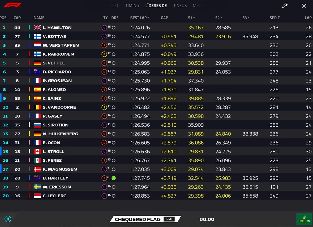 Russell teve mais o que lamentar porque o motor Mercedes de seu carro estourou, o que é um histórico raro na equipe. O problema é que dali em diante a corrida ficou insuportável. Com a bandeira vermelha, todo mundo ficou na mesma estratégia. Algumas disputas soltas e nada demais. Verstappen abria para Hamilton, que controlava Alonso, que controlava Gasly, que brigava com Sainz e Stroll, enquanto Pérez ficava preso atrás de Norris, com um pelotão com Ocon e o resto brigando de foice no escuro.